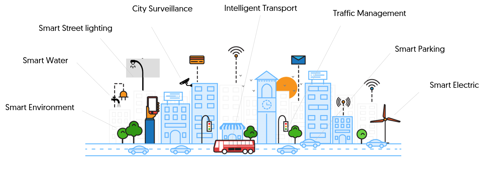 - Smart Transportation – End-to-end transportation solution for vehicle tracking, dispatching, parking area management, and optimal fuel consumption